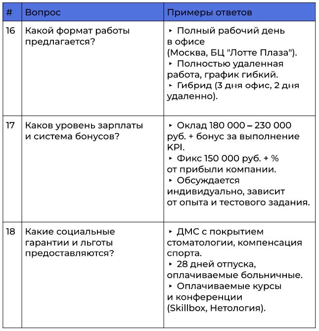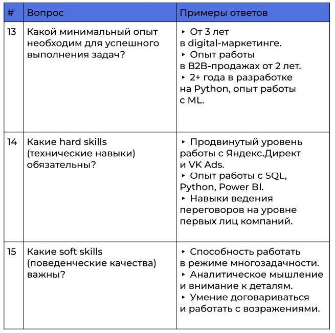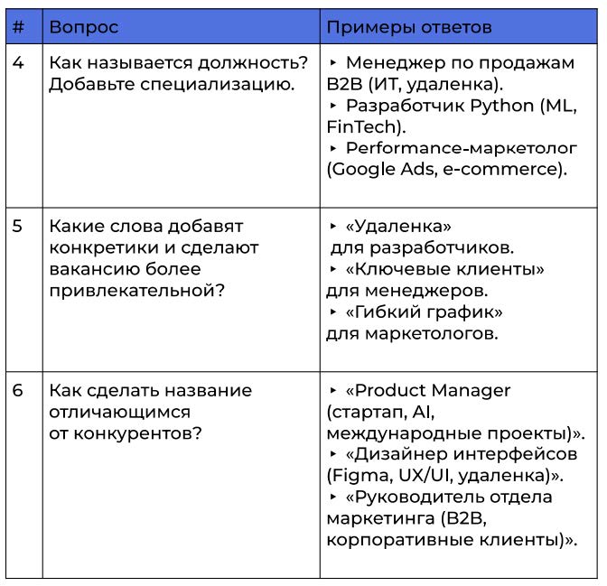 ❌ : « ». « ». « ». ✅ : « Python . ». « – , ». « 2+ , ». 2: : – , . , , . , .❌ :«».« ».«». ✅ : « B2B (, )». « Python (ML, FinTech, )». «Performance- (Google Ads, e-commerce)». 3: : , . , , .❌ :« – ».« ».« ». ✅ : « – -, 5 - ». «. – , ». « Ozon Wildberries, 2-3 ». 4: : , , . , . – .❌ : « ». « ». « ». ✅ : « VK Ads ROI 300%». « 10 ». « ML- Ozon». 5: : , , . – , .❌ :« Excel 1».«».«». ✅ : « Power BI, SQL». « ». « performance-, VK Ads .». 6: : . . , , , – , .❌ :« ».« ».« ». ✅ : « – : + 2 ». « 200 000 . + KPI». « , , Python Coursera». 7: : — . , , , . .❌ :« ».« ».« , ». ✅ : « , (PDF) hr@company.ru “ ”. 3 ». « Telegram @company_hr. – ». « hh.ru job@company.ru. ». :« , ?»