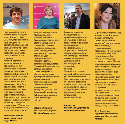 , , -, , , ̆ ̆ , -, UniCredit Bank, , -, , ̆, , , , -, -, Syngenta, , , , ,, , , Mirax Group, , , , , , FERRIT, , LOTTE, , DIS group, , , , , , , , , RuTube, , , -, , TopS Business Integrator, , RU-CENTER, ( ), ., , , BDO Russia, Swiss Appraisal, Media Instinct Group, Dentsy, Digital Alliance, , / , «MI Group», Ketchum, Robertson & Blumscorp., Hohland, AGAMA, , , X5 Retail Group, , / , PEPSICO, --, , , , , STATIO, SMART group, ANKER, fitoutPRO, , , , NISSA, Renault(), , Carpet House, - , , HP Russia, , , , , (Ascott group), , , GLOBBING, People Insight, GALLAHER Ligget-Ducat, , Caprice, , , Conde Nast, , (--), , LifeBook, , -, NCPharm, VeraPharm, , Roche, , Promomed, , INPAS, , , BLOCK Motors, , NRG, ̆-, , , -, -, , Ancor, StaffLine, , , , .